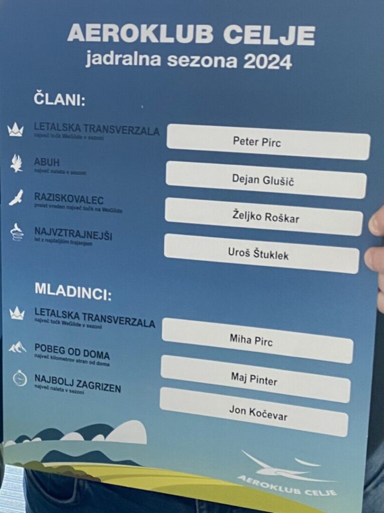 Ob koncu leta je predsednik jadralne sekcije podelil priznanja najvztrajnejšim jadralnim pilotom za leto 2024