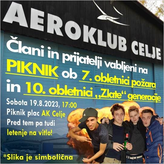 VABILO NA PIKNIK IN LETENJE Z VITLO 10 let po koncu našega šolanja vas generacija 2013 vabi na piknik, ki bo to soboto 19.8. služil tudi kot že tradicionalno druženje ob 7. obletnici požara. Ob tej priložnosti bomo, če bo to vreme omogočalo, organizirali tudi letenje na vitlo. Priložnost za vse, ki potrebuje štarte, želite povaditi pristanke ali […]